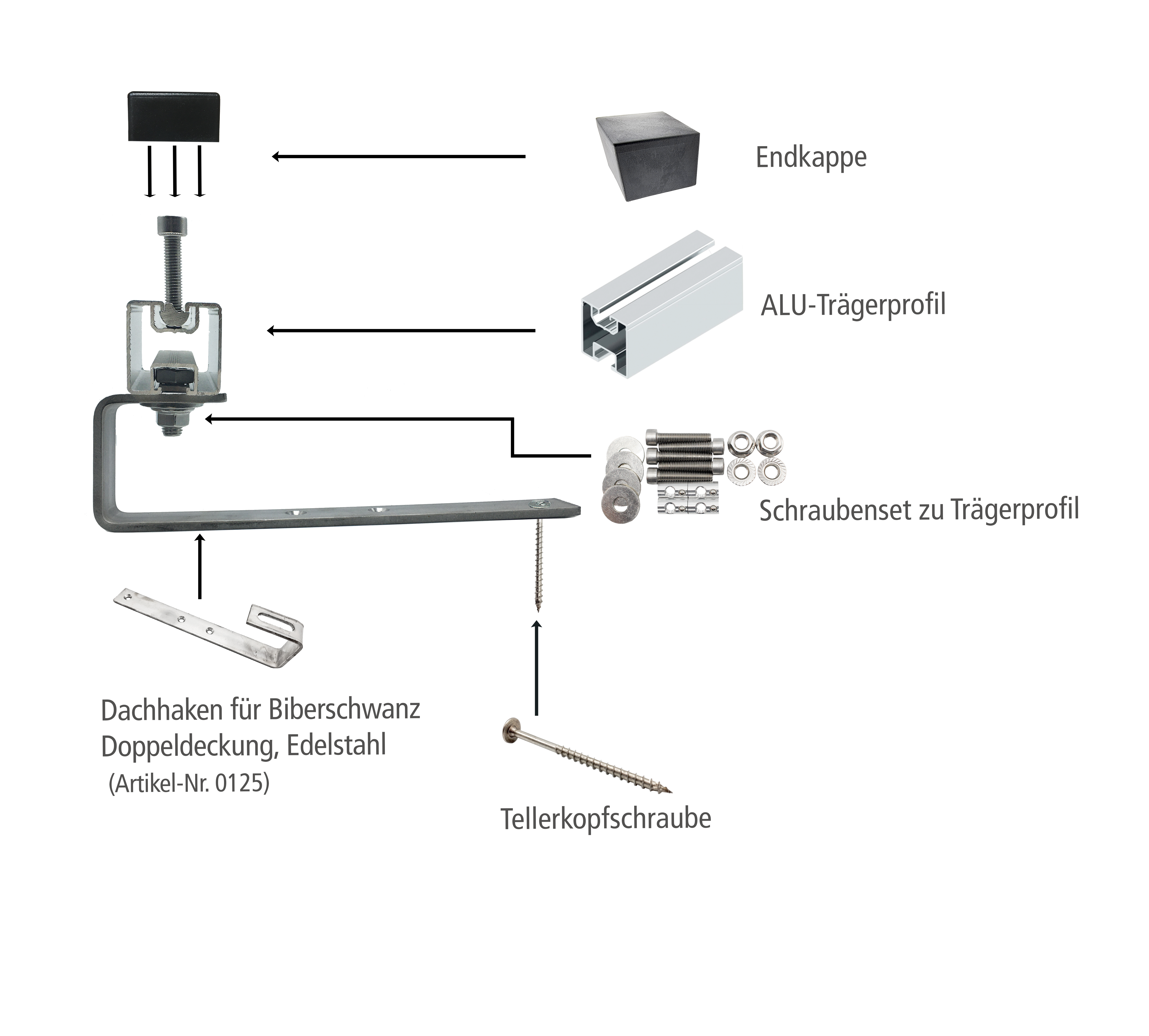 Aufdach Montagesystem für Eurotherm-Solar PRO 15R Vakuumröhrenkollektor - Biberschwanz Die Befestigung von Vakuumröhrenkollektoren erfordert spezielle Träger- und Montagesysteme, um eine sichere und stabile Installation zu gewährleisten. Dieses Unterkonstruktions-Set ermöglicht Ihnen die sichere Montage Ihrer Eurotherm-Solar PRO Kollektoren auf Ihrem Schrägdach und eignet sich perfekt für verschiedenste Auslegungen. Unser Montagesystem zur Kollektorbefestigung ist ein Set von Trägerprofilen, das speziell für die Befestigung des Eurotherm-Solar PRO Vakuumröhrenkollektor entwickelt wurde. Dieses Trägerprofilset besteht aus robusten und korrosionsbeständigen Materialien wie Aluminium und Edelstahl und ist so konstruiert, dass sie eine sichere und stabile Befestigung der Kollektoren ermöglichen. Das Trägerprofilset umfasst alle notwendigen Komponenten wie Profile, Dachhaken, Schrauben, Muttern, um die Kollektoren sicher und fachgerecht zu befestigen. Vorteile des Aufdach Montagesystem Aufdachsystem mit einfacher Montage parallel zur Dachfläche. Installation auf jede Stegbreite möglich. System ist schnell und einfach zu installieren. Verbindung zwischen Profilen durch Innenprofil und Selbstbohrschrauben, ohne Beeinträchtigung der Paneelenbefestigung möglich. Passgenaue Länge, abgestimmt auf unseren Eurotherm-Solar-PRO Vakuumröhrenkollektor Sicherer und dauerhafter Halt der Kollektoren Robust und korrosionsbeständig Statisch berechnete Konstruktion Made in Germany Lieferumfang Profil 10R 15R 20R 25R 30R Profilschienen 2 x Länge in cm (2x) 85 125 164 203 237 M8 Nutenstein 4 x 6 x M8x40 Zylinderschraube 4 x 6 x M10x25 Schraube 4 x 6 x M10 Unterlegscheibe 4 x 6 x M10 Flanschmutter 4 x 6 x Dachhaken 4 x 6 x 8x80mm Tellerkopfschrauben 8 x 12 x Endkappe 4 x Technische Daten Aluprofil Ausführung Ultralight Materialart Aluminium Maße 40 x 40 mm Regelspannweite 1,6 m Gewicht 779 g/m Schnellast sk = 1,21 kn / m2 Modullast 0,22 kn / m2 Windlast WSog = -0,80 kn / m2, Wdruck = 0,40 kn / m2 Montagekanal 1 x M8 Nut für Nutensteine, 1 x M10 Nut für Sechskantschrauben Nutenstein Materialart Aluminium Durchmesser 8 mm Gesamtlänge 22 mm Höhe 10 mm Breite 13 mm Gewicht per 100 St. 0,39 kg Sonstiges mit Führungssteg und Federkugel Zylinderschraube Materialart A2 Durchmesser 8 mm Gesamtlänge 40 mm Gewindeart metrisch Antrieb SW6 Antriebsform Innensechskant Mindest-Festigkeitsklasse 700 N/mm2 Kopfform Zylinderkopf Sechskantschraube Materialart A2 Durchmesser 10 mm Gesamtlänge 25 mm Kopfhöhe 6,4 mm Eckmaß 18,9 mm Antrieb Sechskantkopf Antriebsform SW17 Mindest-Festigkeitsklasse 700 N/mm2 Unterlegscheibe Materialart A2 Materialstärke 2,5 mm Innendurchmesser 10,5 mm Außendurchmesser 30 mm Härte 140 HV Gewicht per 100 St. 1,13 kg Flanschmutter Materialart A2 Durchmesser 10 mm Gewindeart metrisch Antrieb SW15 Antriebsform Außensechskant Mindest-Festigkeitsklasse 700 N/mm2 Höhe 10 mm Sonstiges mit Sperrverzahnung Dachhaken Materialart Rostfreier, ferritischer Edelstahl - WNr: 1.4016 - magnetisch Höhe 120 mm Abmessungen 30 x 280 mm Ziegeltyp Biberschwanz Tellerkopfschrauben Materialart A2 Gewindedurchmesser 8,0 mm Kopfdurchmesser 20,0 mm Gesamtlänge 80 mm Gewindelänge 70 mm Endkappe Maße 40x40mm Farbe schwarz Material PVC Sonstiges zum Überstecken UV beständig